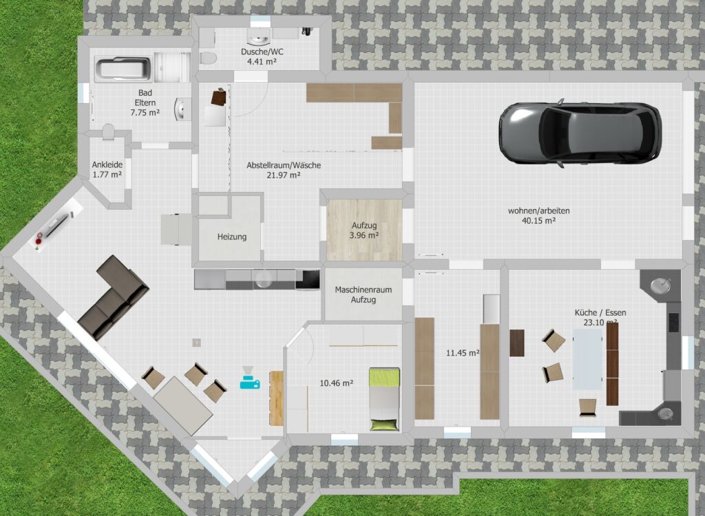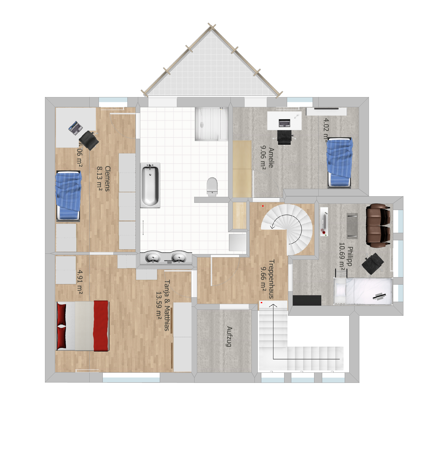 Grundrisse Untergeschoß / Einliegerwohnung / Garage / Technik Erdgeschoss / Terrasse 1.Stock Dachgeschoss